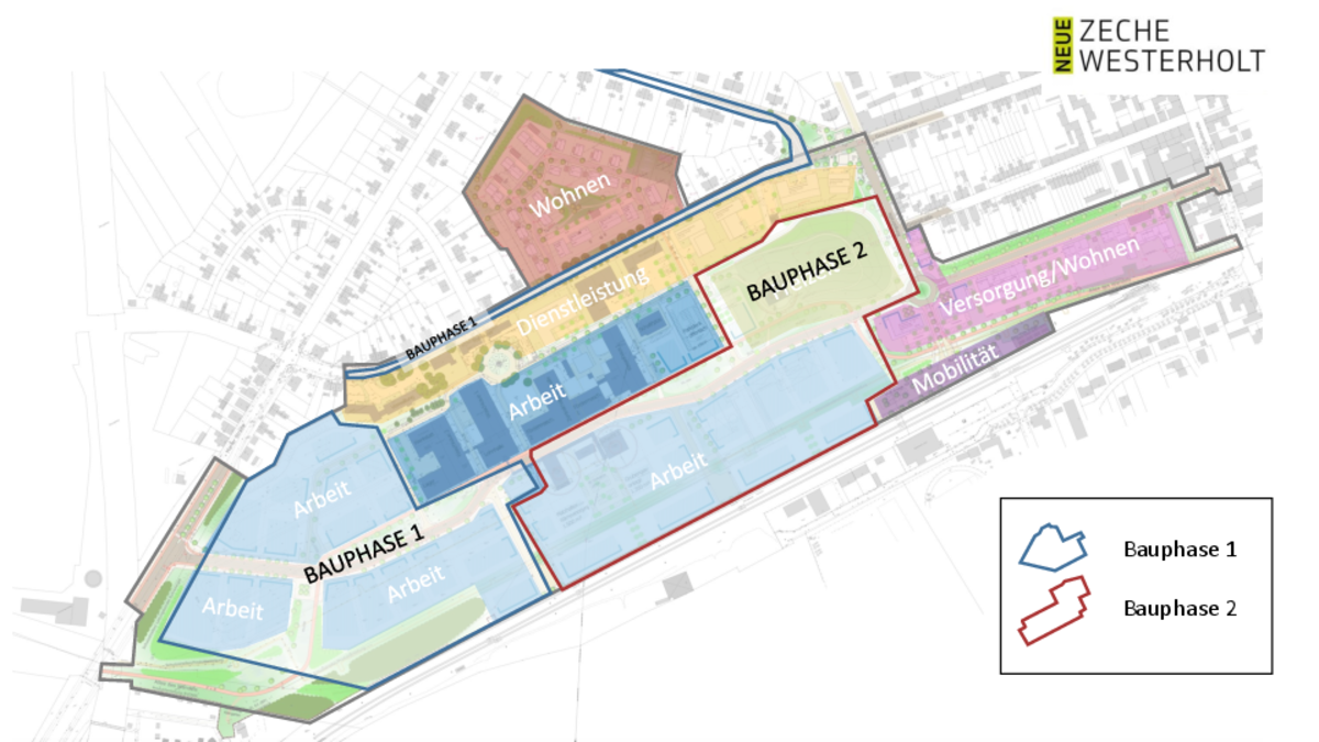 Gesellschafter der Entwicklungsgesellschaft Neue Zeche Westerholt mbH, sind die beiden Städte Gelsenkirchen und Herten sowie der ehemalige Grundstückseigentümer RAG Montan Immobilien GmbH. Die Gesellschafteranteile sind paritätisch gedrittelt. Mit der Förderempfehlung durch den Strukturstärkungsrat erhält die Gesellschaft nun die Möglichkeit, formelle Förderanträge bei der Bezirksregierung Münster einzureichen. Das 39 Hektar große Areal der ehemaligen Zeche Westerholt liegt auf der Stadtgrenze von Gelsenkirchen und Herten. Die Förderanträge, die unter anderem die verkehrliche Anbindung, Entwässerungs- und Kanalbauarbeiten, Freiflächengestaltung sowie die Baureifmachung des Geländes umfassen, beziehen sich auf etwa 23 Hektar und sollen in zwei Bauphasen erfolgen: Von 2025 bis 2028 sollen 12,3 Hektar im Westen des Areals entwickelt werden, von 2029 bis 2032 sollen 10 Hektar im Osten folgen. Insgesamt werden für die Arbeiten rund 100 Mio. Euro veranschlagt, die sich neben der Förderung auch durch den späteren Verkauf von baureifen Grundstücken weitgehend amortisieren sollen. 26 stadtprägende Bestandsgebäude, die Hälfte davon unter Denkmalschutz, werden in das städtebauliche Konzept der Revitalisierung einbezogen.