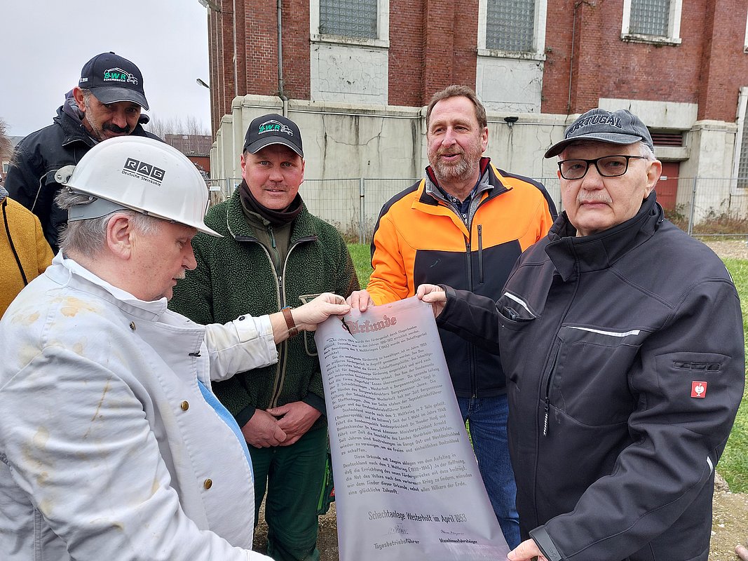 Bei der Öffnung kam unter den Augen der Entwicklungsgesellschaft Neue Zeche Westerholt und vieler Gäste eine Urkunde zum Vorschein. Auf der Urkunde ist die Geschichte des ehemaligen Schachtgerüstes 2 beschrieben, das 1944 durch Bomben zerstört wurde.