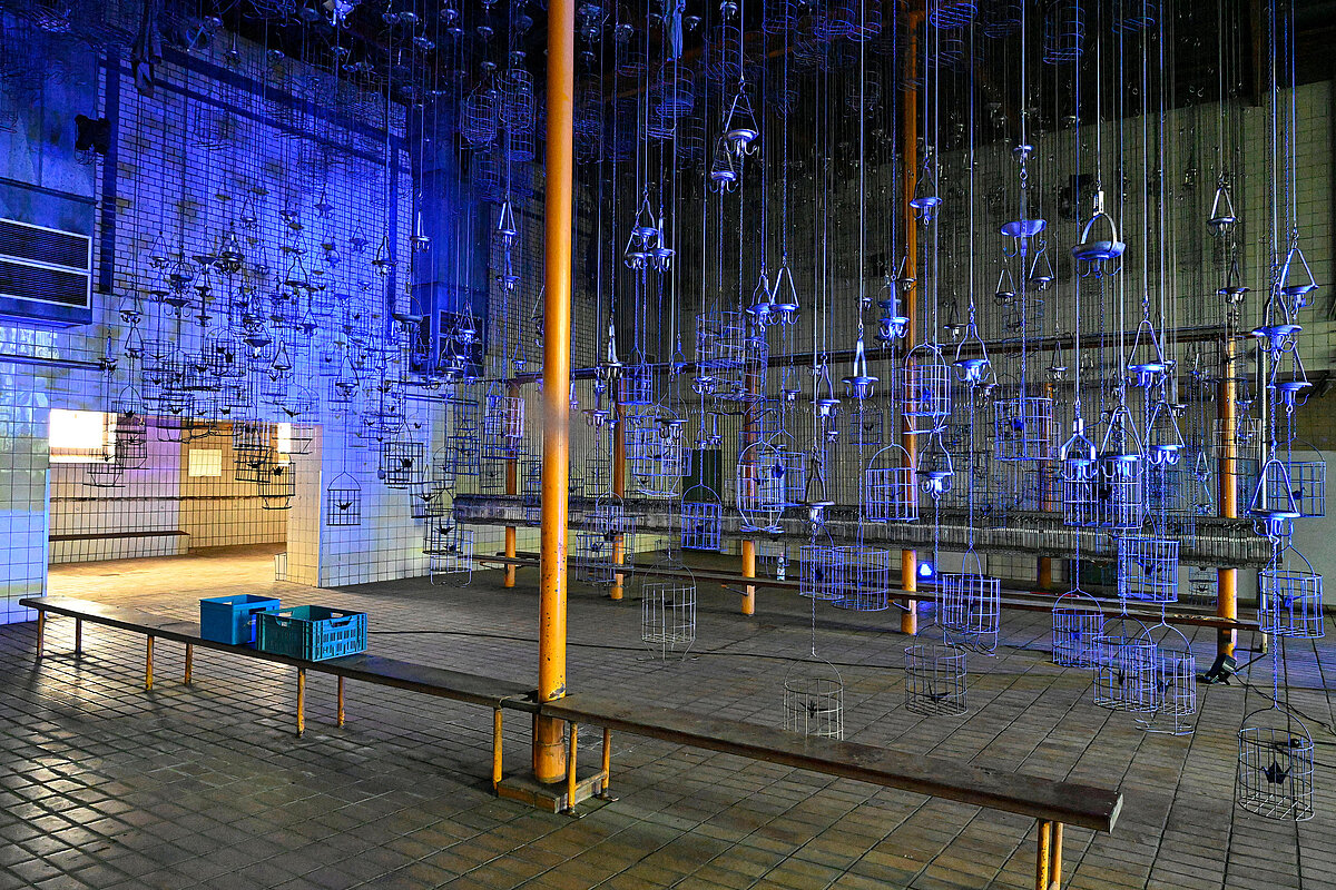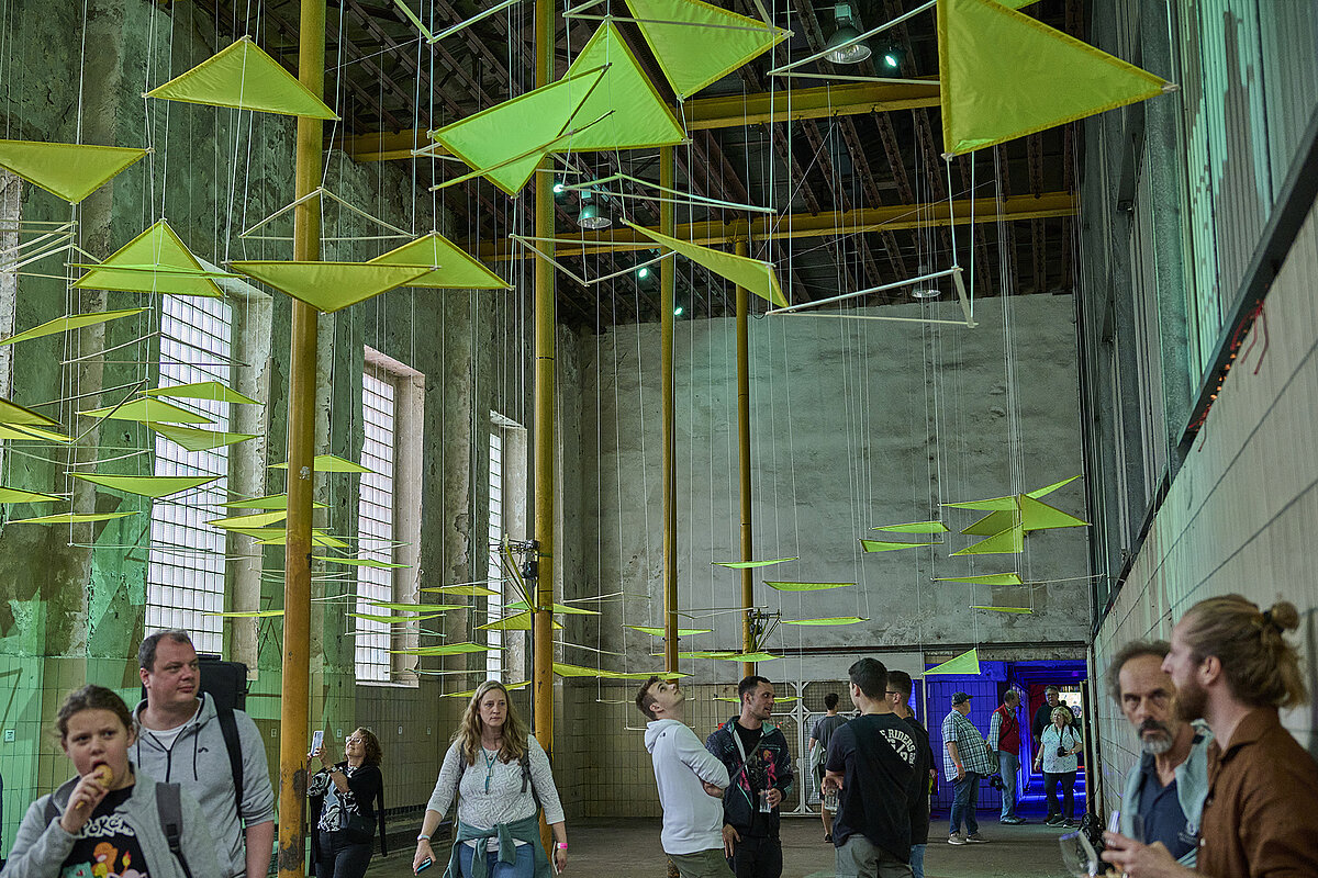 Künstlerinnen und Künstler prägen den Wandel auf vielfältige Weise: Das Kaskaden-Wasserspiel von Many Szejstecki erinnert an die Geschichte der Kohlenwäsche – gestaltet aus Originalmaterialien des Bergbaus. Die Metall-Kumpel von Paul Dröge und Christoph Lehmann stehen als stählerne Zeugen für die harte Arbeit unter Tage. In der Schwarzkaue hängen Origami-Kraniche von Chiara Dahlem – sie symbolisieren Leichtigkeit und Aufbruch. Und Jan Gerlings Installation Sigma II reagiert auf Bewegung im Raum und verwandelt Stoff, Technik und Licht in ein atmendes Raumwesen.