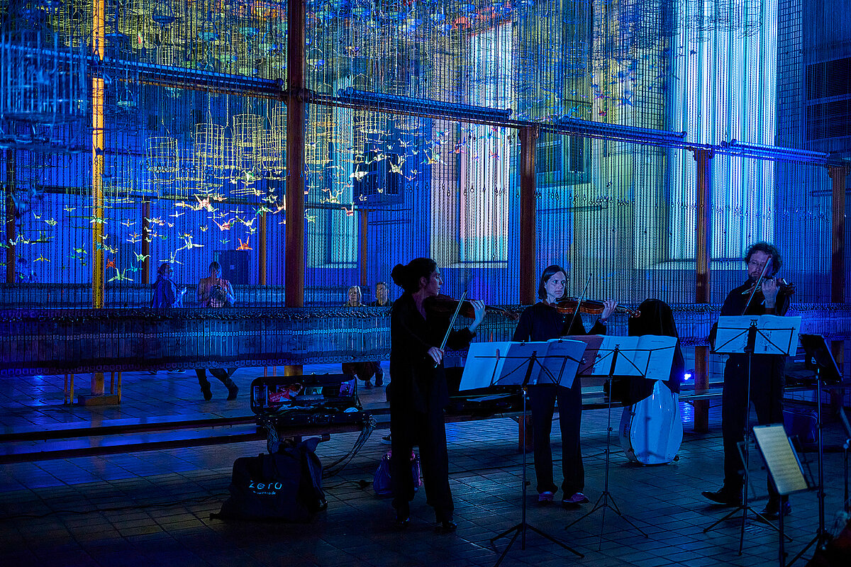Die Konzept-, Installations- und Lichtkünstlerin Chiara Dahlem möchte mit ihren Origami-Kranichen in den Kauenkörben etwas Leichtigkeit in die Schwarzkaue bringen. Die Papier-Kraniche wechseln je nach Lichteinfall ihre Farbe und symbolisieren damit ihre Befreiung aus den Käfigen hinauf zum Fenster. Die Luxemburgerin stellt mit ihrer Installation einen Bezug zur aktiven Arbeit des Bergmanns im Stollen und zum Ende des Bergbaus her. Entstanden war die Installation im Rahmen des RUbug-Festivals für urbane Kunst 2022 auf der Neuen Zeche Westerholt.