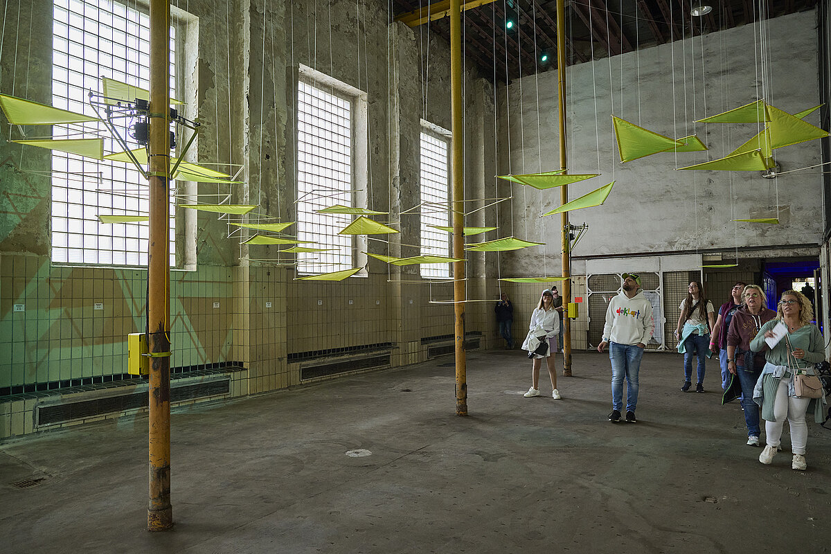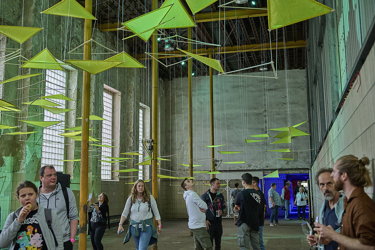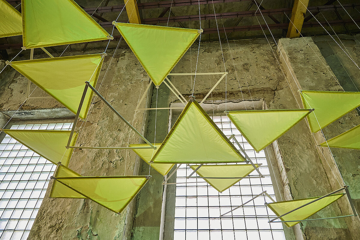 Jan Gerling bewegt sich in seinem Schaffen immer an der Schnittstelle zwischen Kunst und Design, mit direktem Ortsbezug. Er erschafft Kunstinstallationen, die das Bindeglied zwischen Raum und Mensch sind und mit der die Betrachter in Interaktion treten. Die Materialien hierfür sind in der Regel Tuch und Seil sowie Leichtbaumaterialien aus dem Drachenbau. Außerdem spielen Sensorik und Kinetik oft eine entscheidende Rolle bei der Umsetzung seiner raumgreifenden Installationen. Spannung und Entspannung ist das Thema der abstrakten Rauminstallation „Sigma II“, die den Raum in ein atmendes Lebewesen verwandelt. Sie ist mit Sensoren ausgestattet, die Personen im Raum erkennen. Leistungsstarke Motoren ziehen einen Himmel aus dreieckigen Elementen zurück, sobald sich Besucher*innen ihm nähern.